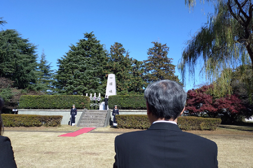 千葉県隊友会・下総水交会会員のご奉仕で、綺麗に刈り込まれた広場に立つ「雄魂の碑」前で、11月26日(水)下総教育航空群司令 吉田太郎1海佐が執行者を務め、殉職隊員追悼式が来賓(殉職隊員遺族4名、翼の会長、千葉県水交会長、千葉県隊友会長代理、第3術科学校校友会長代理、千葉県家族会長、航翔会長代理)及び斉藤海幕長令婦人をはじめ部隊指揮官等多数が参列して執り行われました。