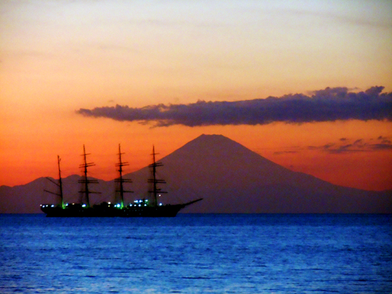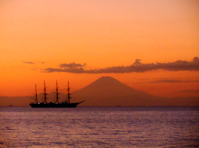 「「鏡ケ浦」:晩秋舟航、夕刻のゴールデンアワーに映える。富士山と帆船